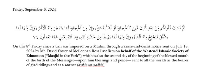 On this 8th Friday since a ban was imposed on a Muslim through a cease-and-desist notice sent on July 18, 2024 by Mr. David Foster of McLennan Ross Law firm on behalf of the Westend Islamic Society of Edmonton (“Masjid in the Park”), which is also the second day of the beginning of the blessed month of the birth of the Messenger—upon him blessings and peace— sent to all the worlds as the bearer of glad tidings and as a warner (bashīr wa nadhīr),